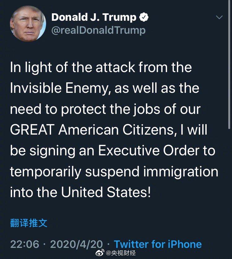 【#特朗普将签署行政令暂停接受移民入美#】美国总统特朗普20日在社交媒体表示,鉴于抗击疫情的需要,以及“为了保护美国人民的就业”,他将签署行政令,暂停接受移民。