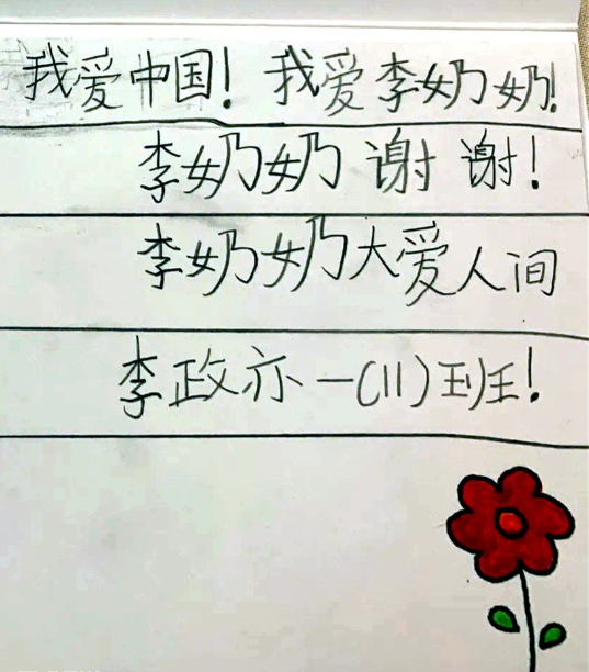 有一天,李政亦和妈妈说:“妈妈,我太爱李奶奶了,我要做一份礼物送给李奶奶,感谢她救武汉的病人。”妈妈买来了她需要的卡纸、贺卡,李政亦经过几天精心的制作,做好了礼物,还写了一封感谢信。在妈妈的帮助下,李政亦给李奶奶准备的礼物和感谢信顺利寄出。